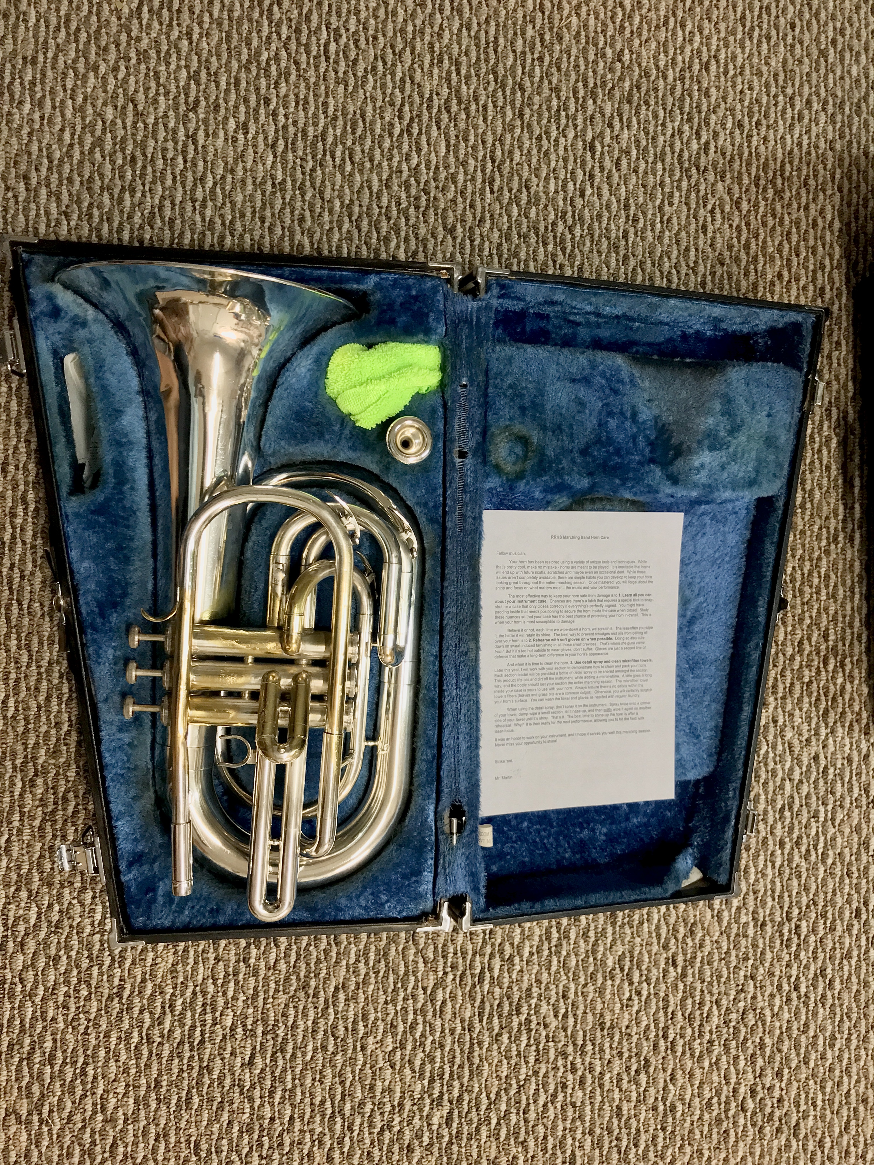 When a student opens their instrument case expecting to see that familiar, uninspiring instrument, yet instead sees their own reflection in it, it’s a pretty special moment. A brand-new instrument may be without flaw, but when an instrument that has served a school for decades comes back to life…it means a great deal more to them. It also presents the opportunity to teach students how to not only maintain the instrument’s new condition, but how to prepare for their performances with pride and esprit de-corps.