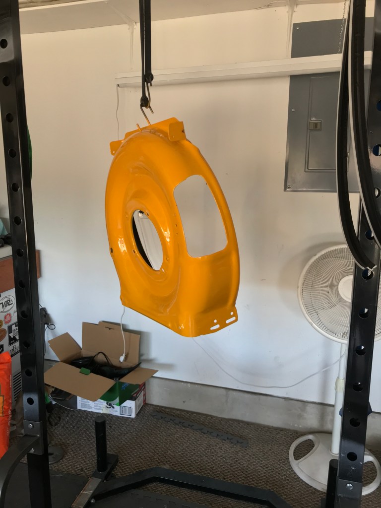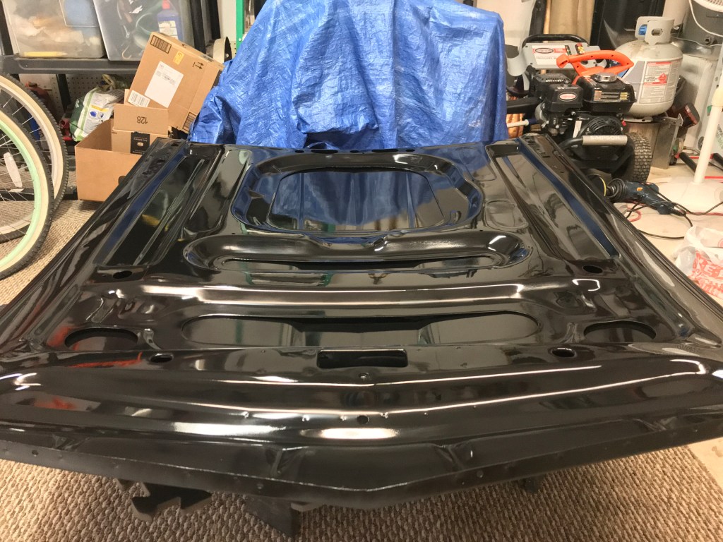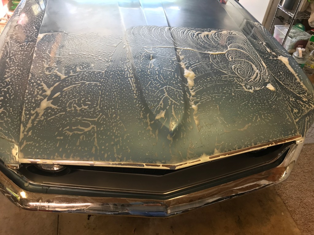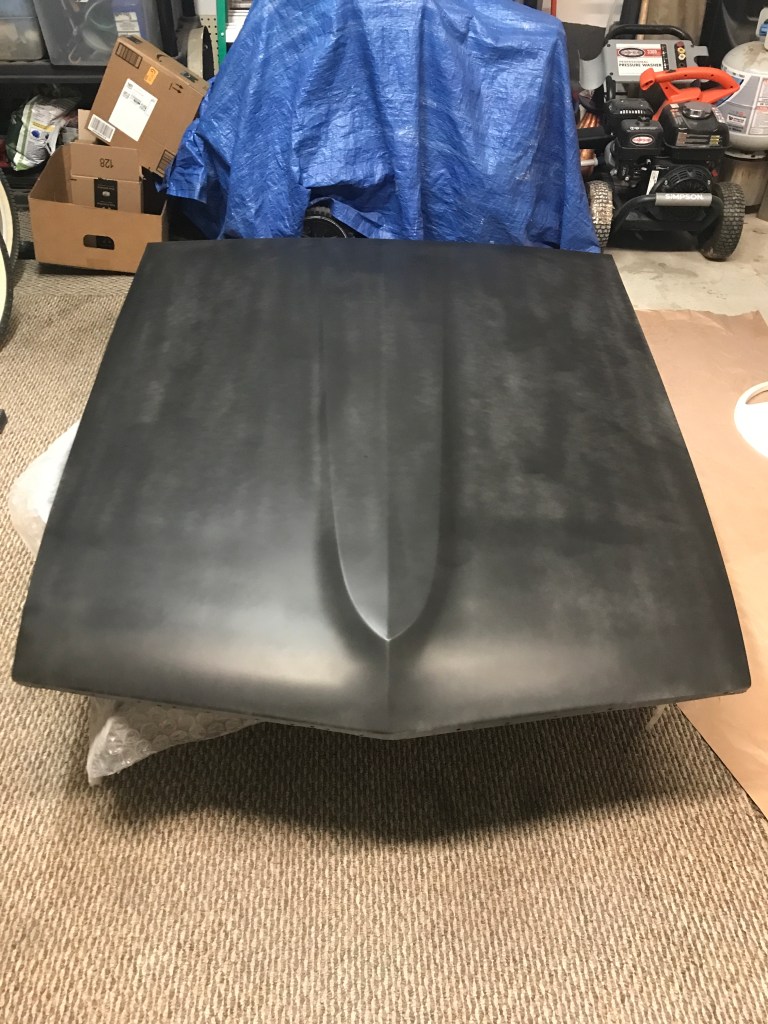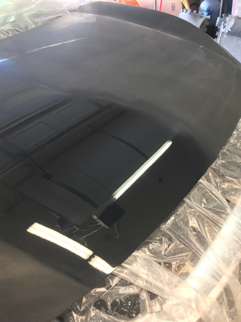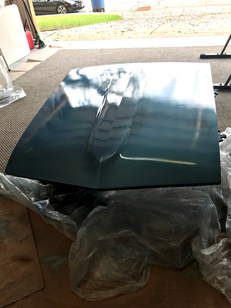 Below are some photos of a 1969 Mustang that I am working-on. The hood is a new replacement. I prepped it, primed it and block-sanded every surface on the top and underside…multiple times. The paint color is Ford’s Winter Blue Poly, and the clearcoat is USC’s SprayMax 2K Glamour High-Gloss Clear. That’s right, it’s an aerosol can application, and completely different than the Rustoleum cans you might be thinking-of.