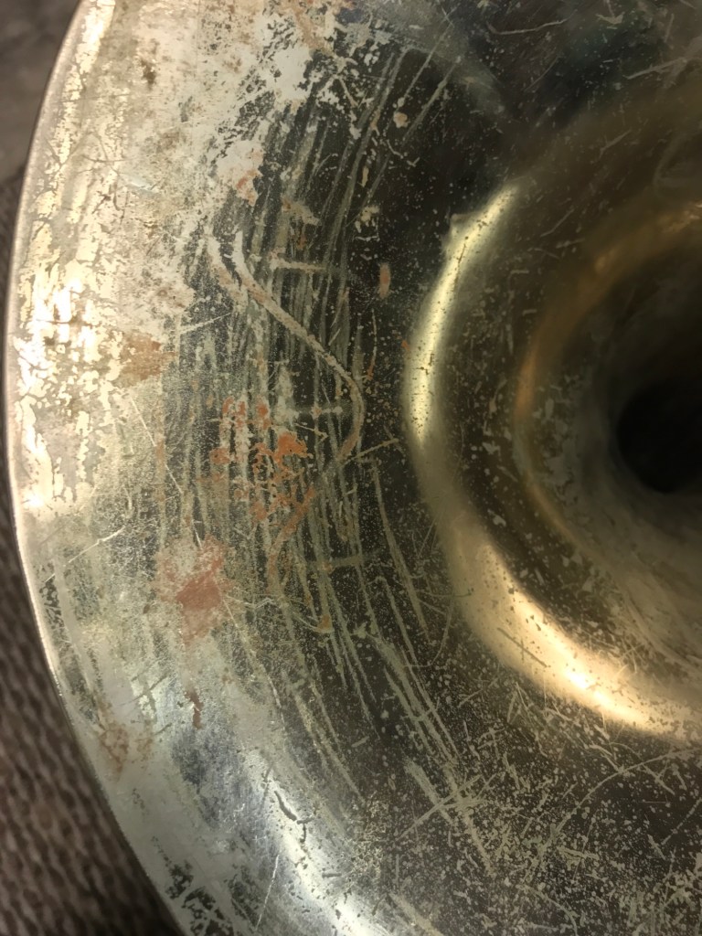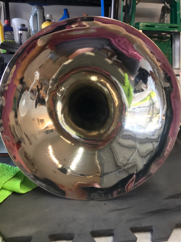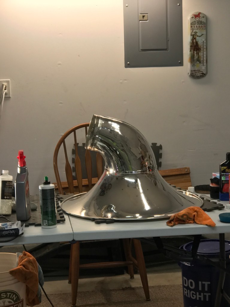 Here’s where we deviate from the automotive realm and consider musical instruments, heirlooms and other metal treasures. I have been fortunate to have earned the trust of the Ronald Reagan High School Marching Band’s leadership to cosmetically restore many of their brass instruments, and have countless repetitions behind me to know I can improve just about any hard surface in safe and lasting ways.